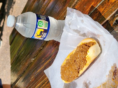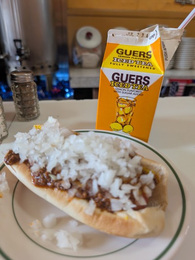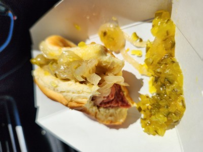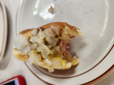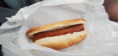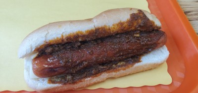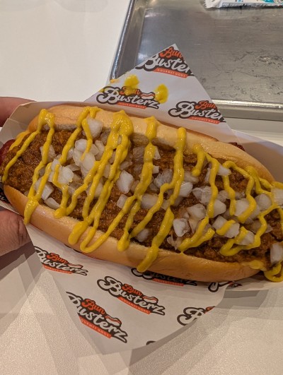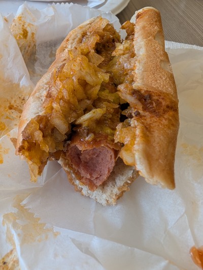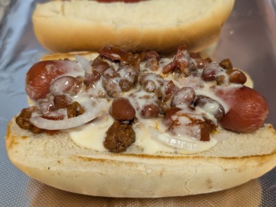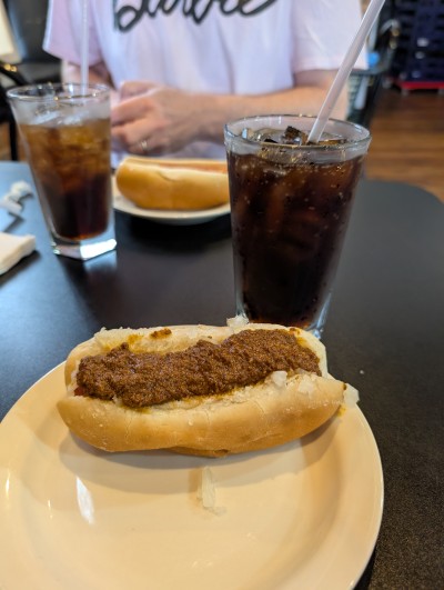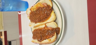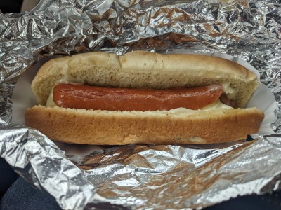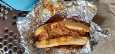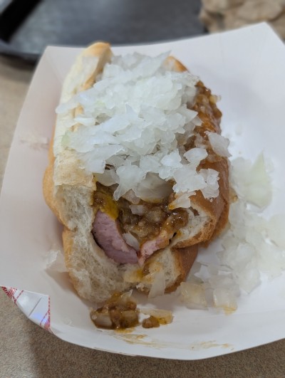 Chili cheese dog with onions. It was barely okay. The bun was toasted, the dog rather large and the chili had a lot of beans.
