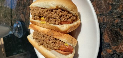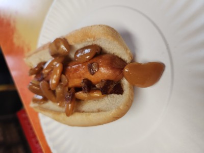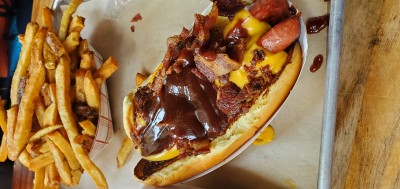 "Augie's Doggie" perfectly grilled bun, dog, chili, onions and cheese sauce. The chili sauce is sweet and tangy.
