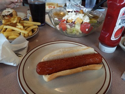I had the "Freaky Frank" or whatever it's called, with "jalapenos and pepper jack." It was average, wasn't impressed. We got a large Greek salad that was a great shared item, and the fries w/ gravy were A-OK.