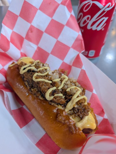 Love the old school vibe! Chili is not wet. Something was spicy. Maybe the mustard. Steamed bun was a bit sodt.