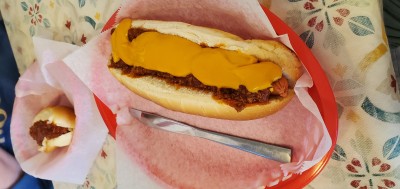 No place to sit inside, chili is different little spicy little sweet. Decent dog